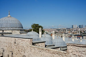 The Süleymaniye Mosque is a magnificent hilltop structure built in the 16th century at the behest of, and named after, Sultan Süleyman the Magnificent in Istanbul , Turkey . It was designed by Sinan , one of the foremost architects of his era and the chief architect to Süleyman for nearly 28 years. Sinan's portfolio is extensive—79 mosques, 34 palaces, 33 public baths, 19 tombs, 55 schools, 16 poorhouses, 7 madrasahs (religious schools), and 12 caravansaries, along with granaries,...