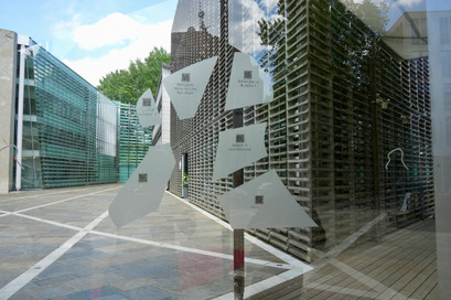 It houses all the countries within a collective of buildings, each unique to the nation it represents. A bluish copper metal wall defines the water surrounding these embassies, symbolizing the North Sea. Throughout Berlin, you can see the scars of WWII, with bullet and shrapnel marks on buildings, or large sections missing; these are the structures that survived, as many more were destroyed. One example seen here is the Italian Embassy: