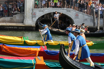Tourism has been a significant part of Venice's economy since the 18th century, when Venice – with its stunning cityscape, uniqueness, and rich musical and artistic cultural heritage – became a stop on the Grand Tour. Today, it is renowned for the Biennale and the Venice Film Festival. We happened to be in town at the same time as the film festival, but somehow did not connect with George or Julia. On the other hand, we did get front row canal for the annual regatta in which many of the gondolas are decorated and the rowers are in traditional garb.